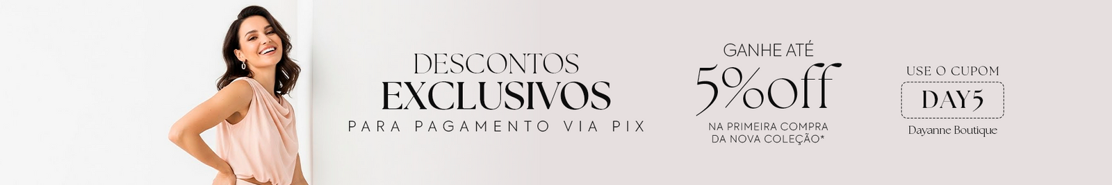 Aproveite nossa entrega para todo o Brasil e use o cupom DAY5 para obter desconto na primeira compra via Pix. Porque na Dayanne Boutique, o seu estilo vem sempre em primeiro lugar!